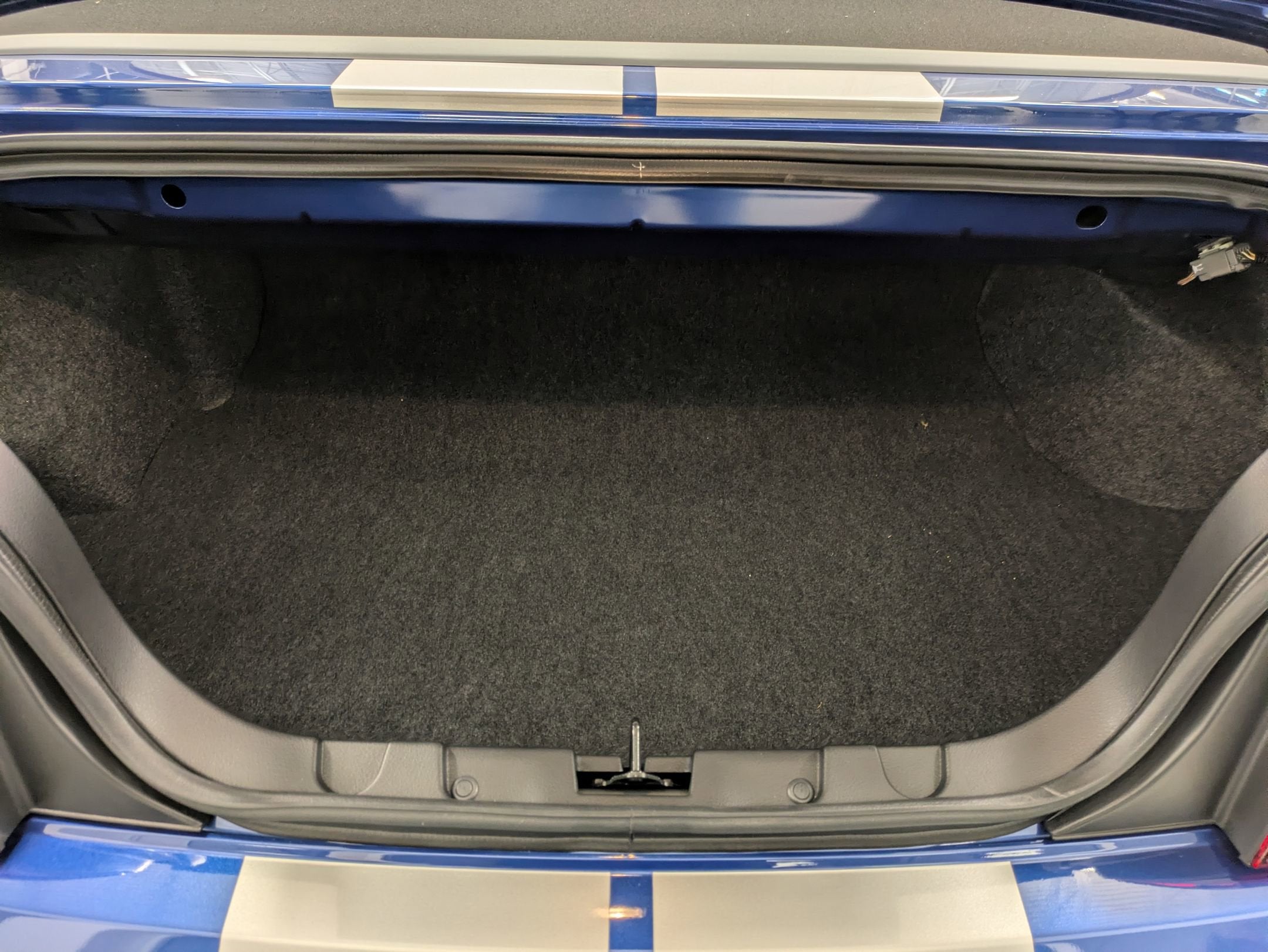 Signature Shelby Style: Finished in classic Performance White with Vista Blue racing stripes, featuring the iconic Shelby hood scoop, side scoops, and billet grille.